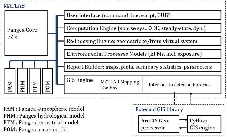 The model structure (functional blocks) is represented in Fig.2. While Pangea v1 was about half MATLAB and half Python/ArcGIS, the mid-term goal with v2 is to propose a MATLAB only model. The main reason is that it is difficult to maintain a model that invloves multiple language, and difficult for users to understand what must be done, when and where. Version 1 was therefore difficult to analyze and debug for both developers and users. Fig.2 shows a Core, a re-indexing engine, a computation engine, a set of environmental models, a GIS engine, and a set of more general models (atmospheric, hydrological, etc). While this figure is a bit outdatted (the model was recently restructured), it shows most constitutive blocks of the model.