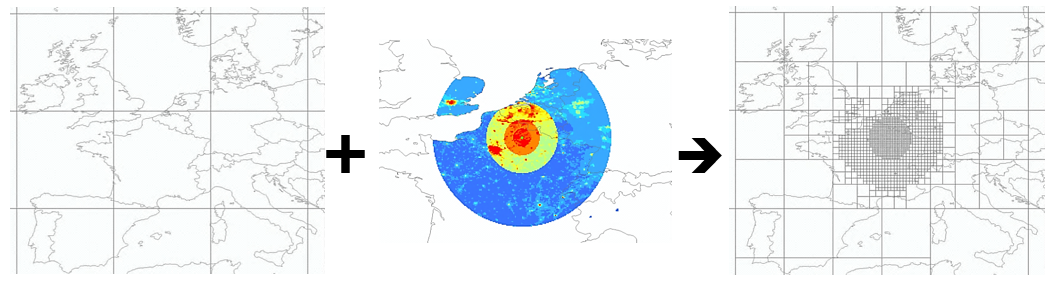 Fig.3 provides an example. A background grid with low resolution is represented on the left. The center respresents a RP obtained as a weighted sum between components made of a raster of population counts, a step function of the distance from a source that is a the center of the disks, and a flag " in land". The figure on the right is the refined multi-scale grid obtained after an iterative refinement procedure.