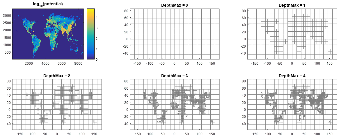The iterative procedure is depicted in another context (RP = global raster of population counts) in Fig.4 : depth 0 is the background grid; the potential is integrated on this grid (providing a summary (SUM of pixels in practice) per cell), and all cells whose summary value is above a user-defined threshold are refined (e.g. split in 4). This defines a new grid; the potential is integrated over this new grid, and so on..