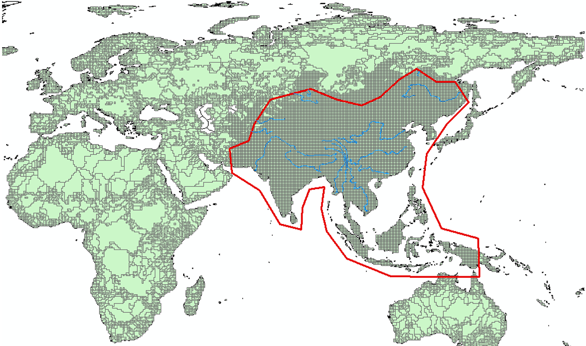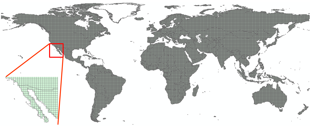 The current version aggregates the roughly 65'000 cells of the WWDRII model into clusters that delineate watersheds. The reason for clustering is that it reduces significantly the size of the numerical system. Fig.6 shows the WWDRII grid, which defines a geometry with maximal resolution.