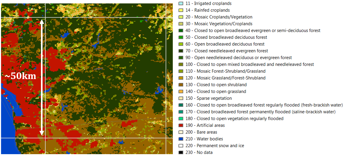 Yet, cells delineate regions with inhomogeneous content, as shown in Fig.7, which provides the land cover type as defined by the GlobCover data set. Each cell (geometry/geography) can potentially lead to more than 20 compartments (GlobCover has 22(3) cover types) that represent homogeneous content in the virtual system. By default, Pangea is aggregating these 22 types into 3 or 4, which reduces the system size, but it would still be extremely resource intensive not to cluster.